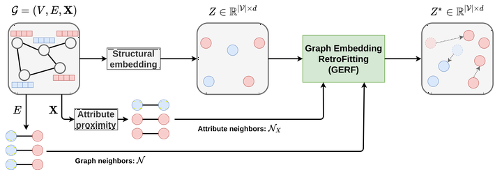 Graph Embedding RetroFitting pipelineRepresentation learning for graphs has attracted increasing attention in recent years. In this paper, we define and study a new problem of learning attributed graph embeddings. Our setting considers how to update existing node representations from structural graph embedding methods when some additional node attributes are given. To this end, we propose Graph Embedding RetroFitting (GERF), a method that delivers a compound node embedding that follows both the graph structure and attribute space similarity. Unlike other attributed graph embedding methods, GERF is a novel representation learning method that does not require recalculation of the embedding from scratch but rather uses existing ones and retrofits the embedding according to neighborhoods defined by the graph structure and the node attributes space. Moreover, our approach keeps the same embedding space all the time and allows comparing the positions of embedding vectors and quantifying the impact of attributes on the representation update. Our GERF method updates embedding vectors by optimizing the invariance loss, graph neighbor loss, and attribute the neighbor loss to obtain high-quality embeddings. Experiments on WikiCS, Amazon-CS, Amazon-Photo, and Coauthor-CS datasets demonstrate that our proposed algorithm receives similar results compared to other state-of-the-art attributed graph embedding models despite working in retrofitting manner.